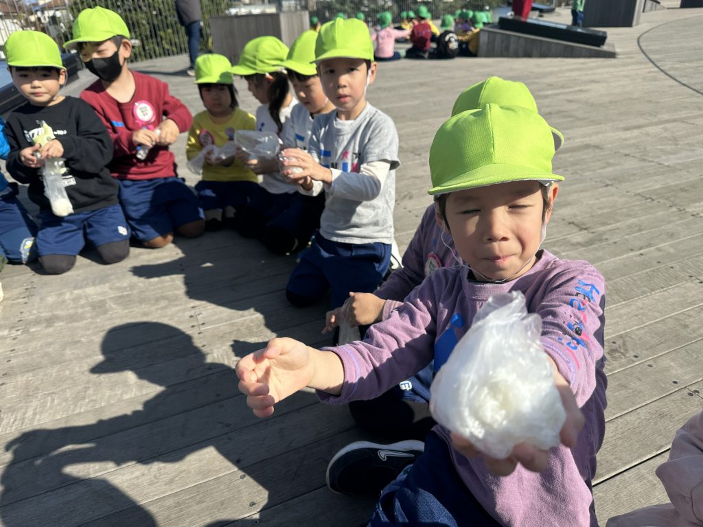 昨日の屋根の上での“おにぎり会”あまりのおいしさに、お替わり、お替わり…の声が止みませんでした。青空のもと、みんなで食べた塩むすび、指についたごはん粒に口を付け、きれいに食べて初めて分かるごはん粒の味、何気ないことですが、この経験を幼児期にして欲しかったのです。