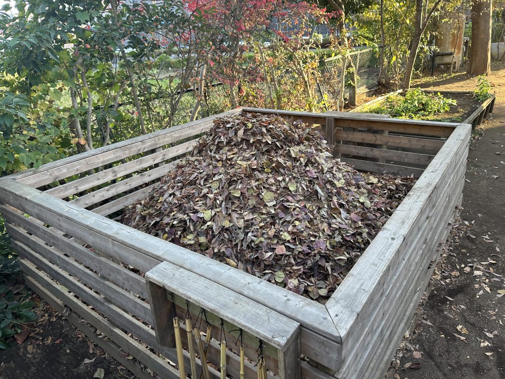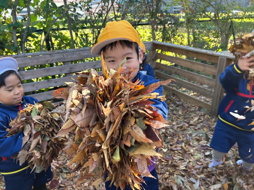 外の教室辺りで子どもたちは、園庭の落ち葉を小さな熊手で集めては、落ち葉プールに入れるお仕事をしています。やがて、ふかふかになった落ち葉の山に飛び込んだり、両手で抱えた落ち葉を高く投げては、降ってくる雪に見立てて遊んでいます。遊びをつくり出す力、その行動の中に子どもたちが考えていること、その目的が見えてきます。このように遊びの中には、様々な子どもの育つ力が発揮されているのです。自然の移り変わりを味方につけて、育って、学んで、楽しんでいる姿ですね。
