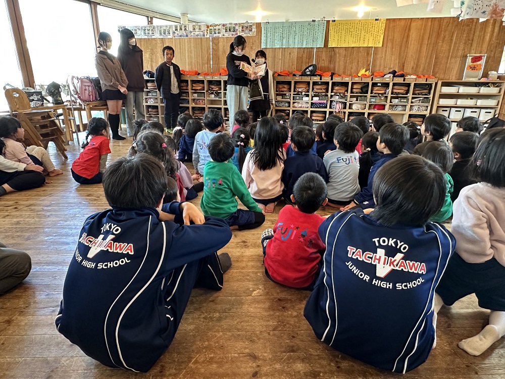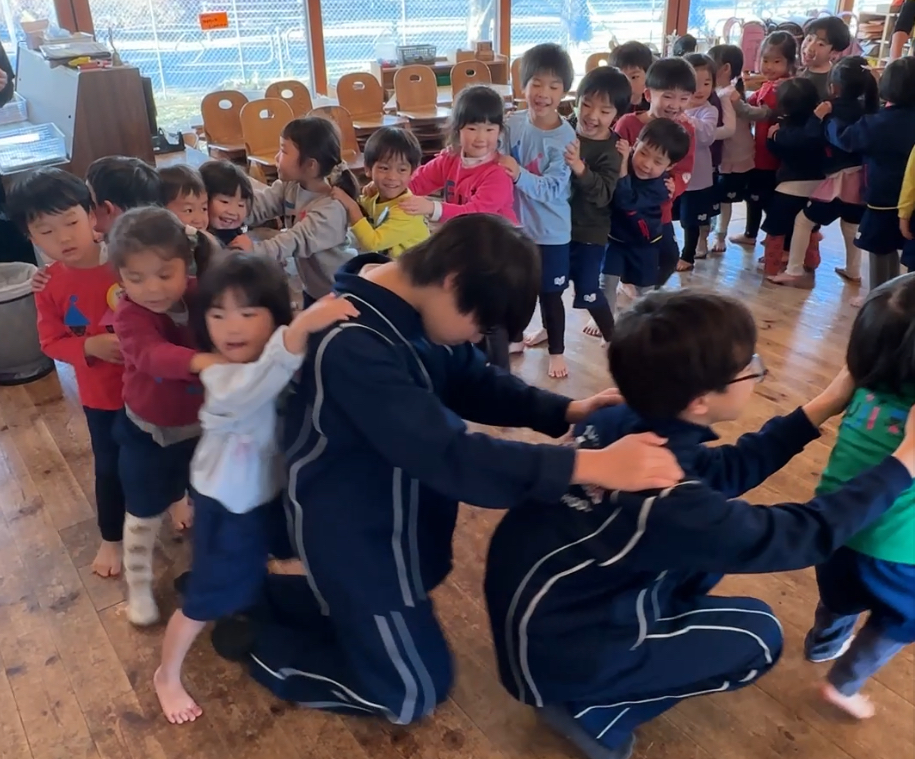 先週、中学生の職場体験がありました。10名の5中生が来てくれました。なんと、みんな卒園児‼うれしいやら、びっくりするやらの感じでしたが、3日間の職場体験がスタートしました。私たちの心配をよそに、子どもたちは中学生のお兄さん、お姉さんの手を引いて、『あそぼ‼あそぼ‼』の連呼です。中学生もよく知っている幼稚園ですので、すぐに一体となって屋根の上や、砂場、各クラスで楽しく遊んだり、紙芝居を披露するなど職場体験をしてもらいました。初日ですが、たまたま、大山小・赤十字委員会との交流会があり、小学生が絵本を読んだり、ジャンケン列車、大きな紙への好きなものお絵かき等々を主導する時間がありました。中学生も幼稚園児と一緒に参加してくれ、ジャンケン列車の時には、お友だちと目の高さを合わせようと膝立ちで歩き回ってくれました。小学生の仕切りで中学生も参加し、幼稚園児が楽しんでいる光景、まさしく、幼小中連携の姿がそこにありました。意図していませんでしたが、異年齢交流、つながり交流、楽しい時間を通して、このような時間をこれからも設けたいと思いました。年のちがいを超えた交流は、特にそれぞれの年齢に沿った心の成長にとても有効だと感じました。