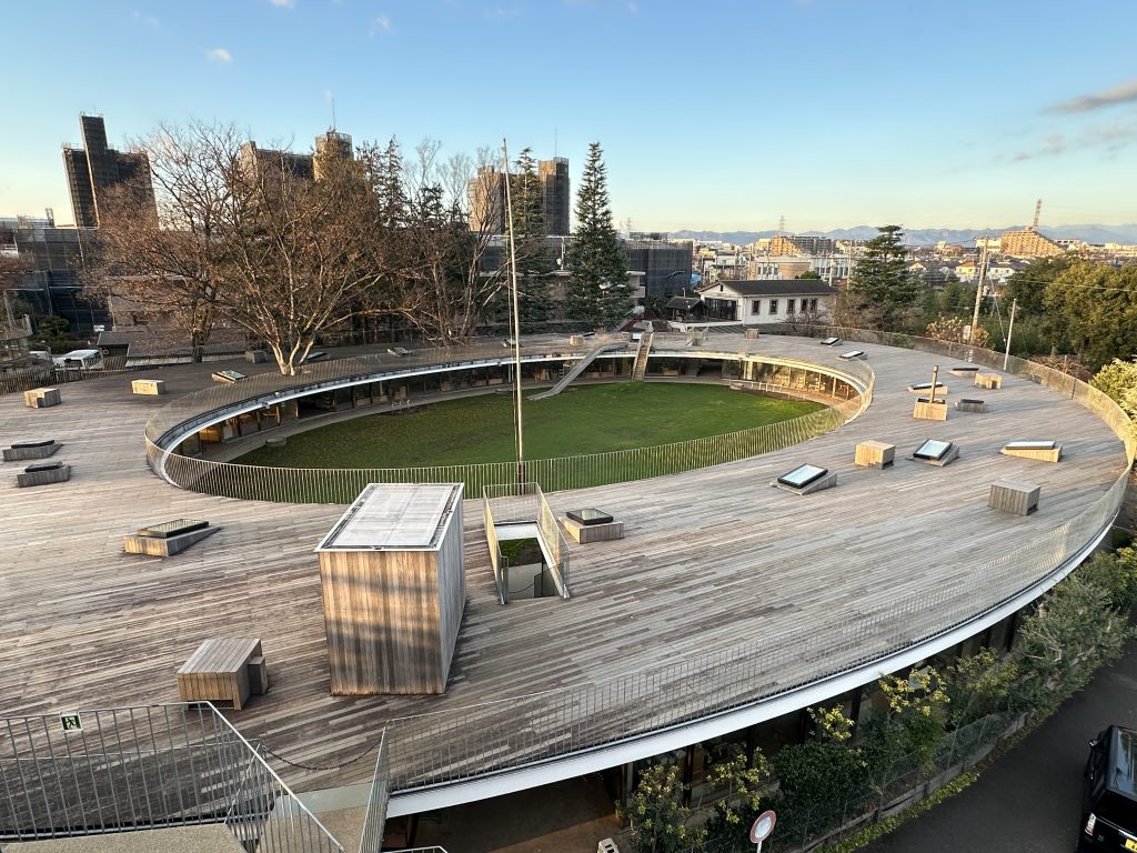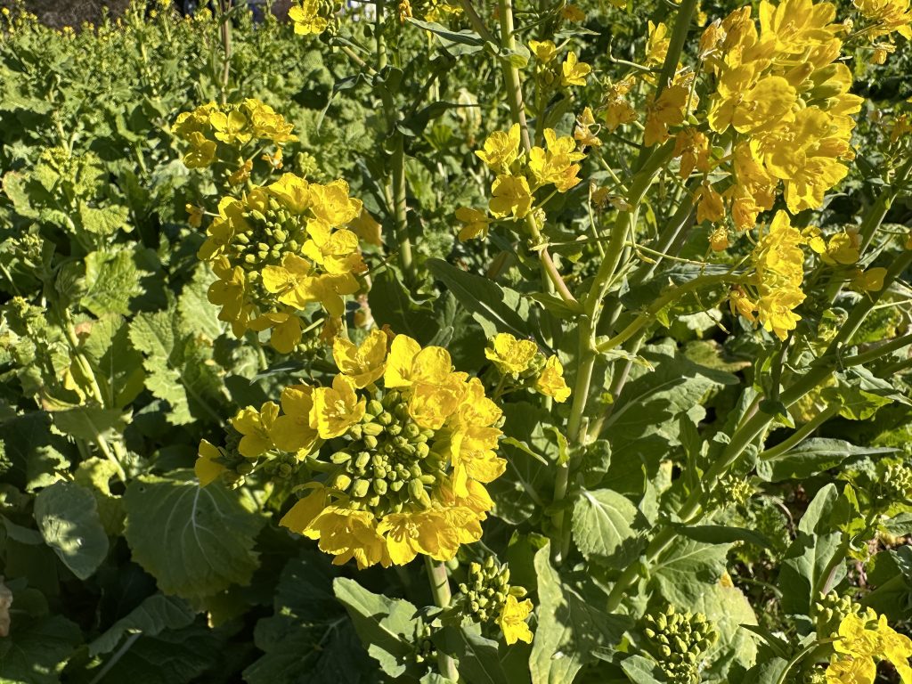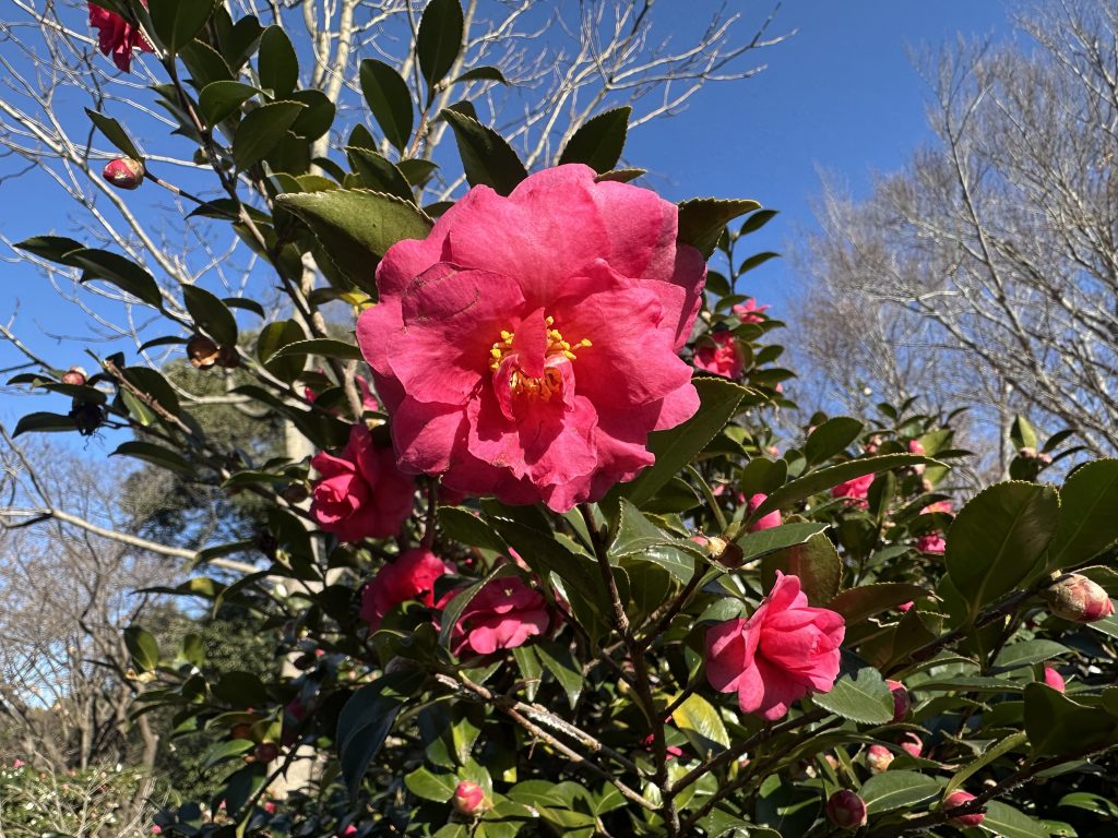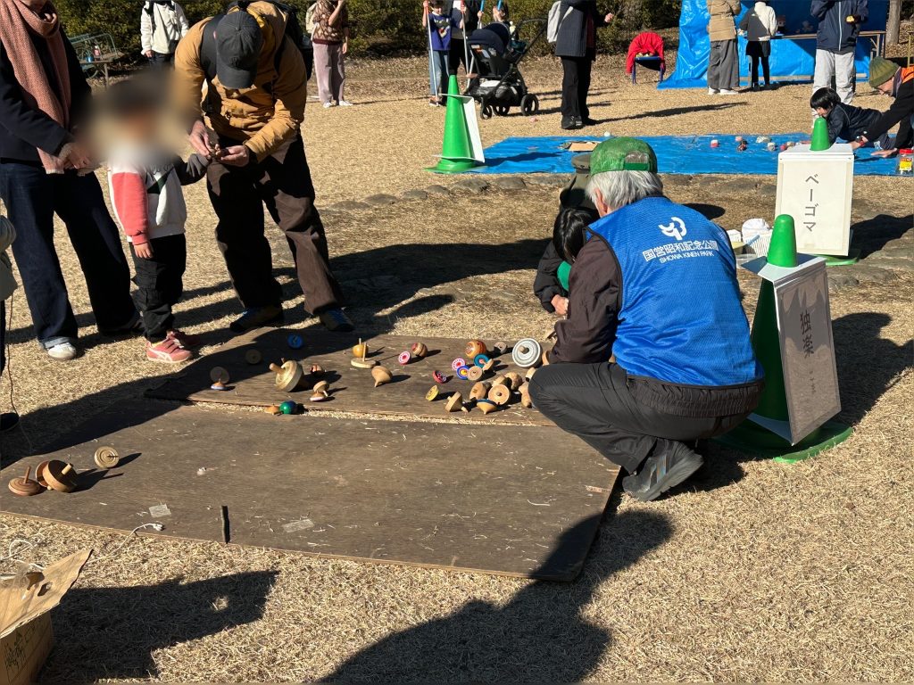 お正月、日差しもあたたかな日、昭和記念公園を散歩していたら、赤いさざんかの花、薄レモン色のロウバイの花に出会い、明るい気持ちになりました。また、みんなの原っぱ北側には黄色の花が咲き始めた大きな菜の花畑もあり、早春を感じたひと時になりました。約2時間ウォーキングしていると、子どもの森近くで毎年9月の子育て教育フェアでお世話になっている立川市クラフト同好会の皆様に出会いました。この会が主催する“昔遊び大会”が開催されていて、多くの子どもたちが集まっていました。福笑い、ダルマ落とし、コマ回し、ベーゴマ、けん玉、羽根つき、ガリガリとんぼ、大根てっぽう、竹ぽっくり、竹とんぼ等々、いろいろなコーナーで、あそび方を知らない子どもたちは会員の皆様の指導のもと、楽しんでいました。特に、竹とんぼ飛ばし方練習機器(動画)は秀逸もので、素晴らしかったです‼幼稚園でも参考にさせていただき遊んでみたいと思いました。実はこの会、ご高齢の方が多い集まりで、おじいちゃんがひ孫に遊びを伝えているようで素晴らしい光景でした。さらに、会長は91才、よく動き、とても元気な方、会長さんに素敵な年の取り方を教えてもらった気がしました。