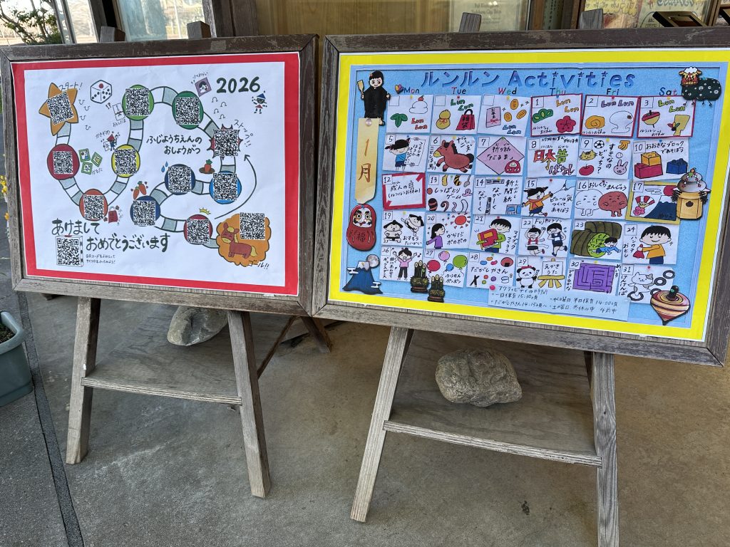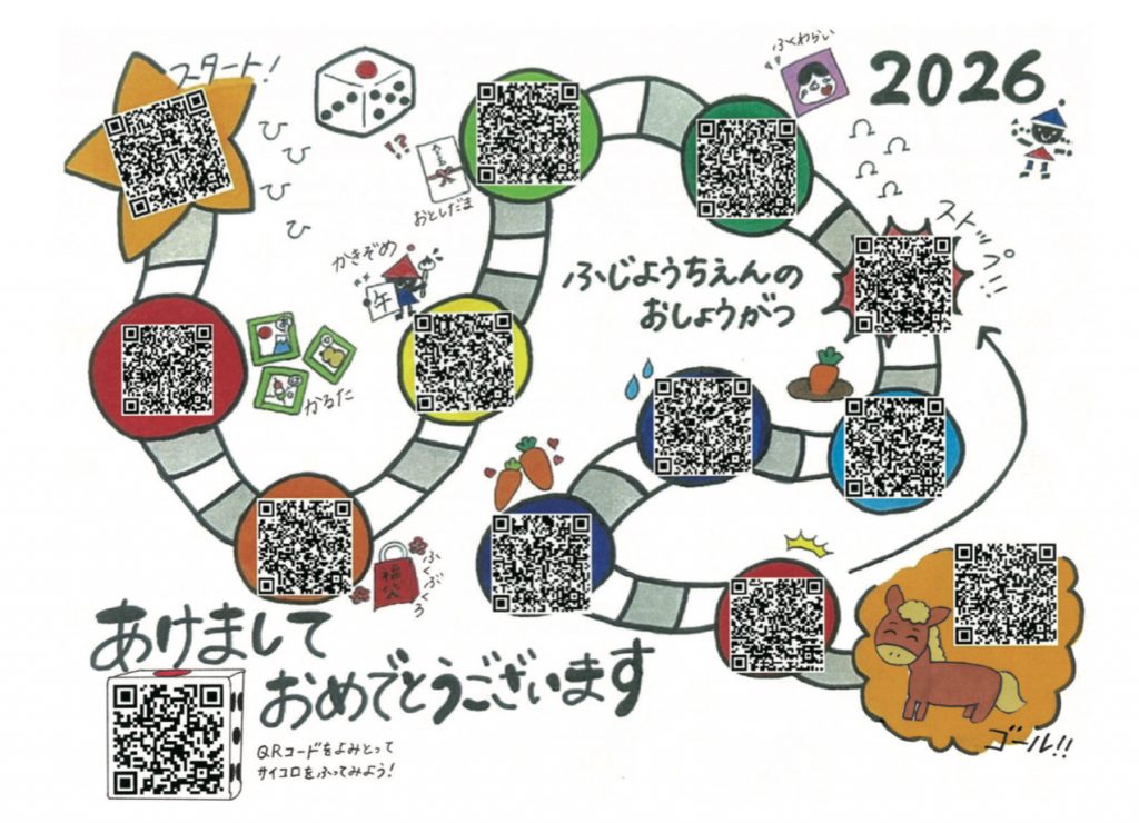 本年の年賀状は、教職員全員参加による“QRコードすごろく”にしてみました。お正月、ご家族様やお友だちと楽しんでもらえればという思いで、ポニーのはるちゃんも登場しての年賀状になりました。とてもおもしろく、ユニークな年賀状ですが、それ以上に教職員みんなが一致団結している姿を見ていただければうれしい限りです。このチームワークこそ、ふじようちえんが輝き続けられる源泉、これからもこのチームワーク力で子どもたちの育ちをしっかりとサポートして行きます。どうぞ、QRコードサイコロで楽しんでくださいね。
