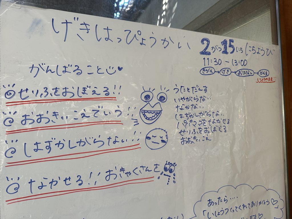 でも、心配する親の気持ちをよそに、練習の成果を発揮して、しっかり演じてくれることでしょう。ご家族で、お子様の成長、そして、劇をハラハラ、ドキドキ、暖かく見守っていただければうれしいです。皆様のお越しをお待ちしています。おたのしみに‼