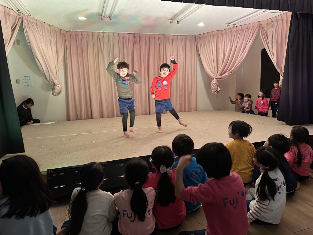最初は、みんなの意見を聞き、何をやってみたい?を話し合いながら、段々と劇の演目や内容ができ、お話の流れを理解する中、それぞれが自分の役になりきり、台詞を覚え、出番を待ち、立ち位置を確認し、台詞を言って演じます。台詞を言う順番に緊張したり、歌ったり、踊ったり、人前で劇を演じることをしながら、みんなで劇を楽しんでいます。
