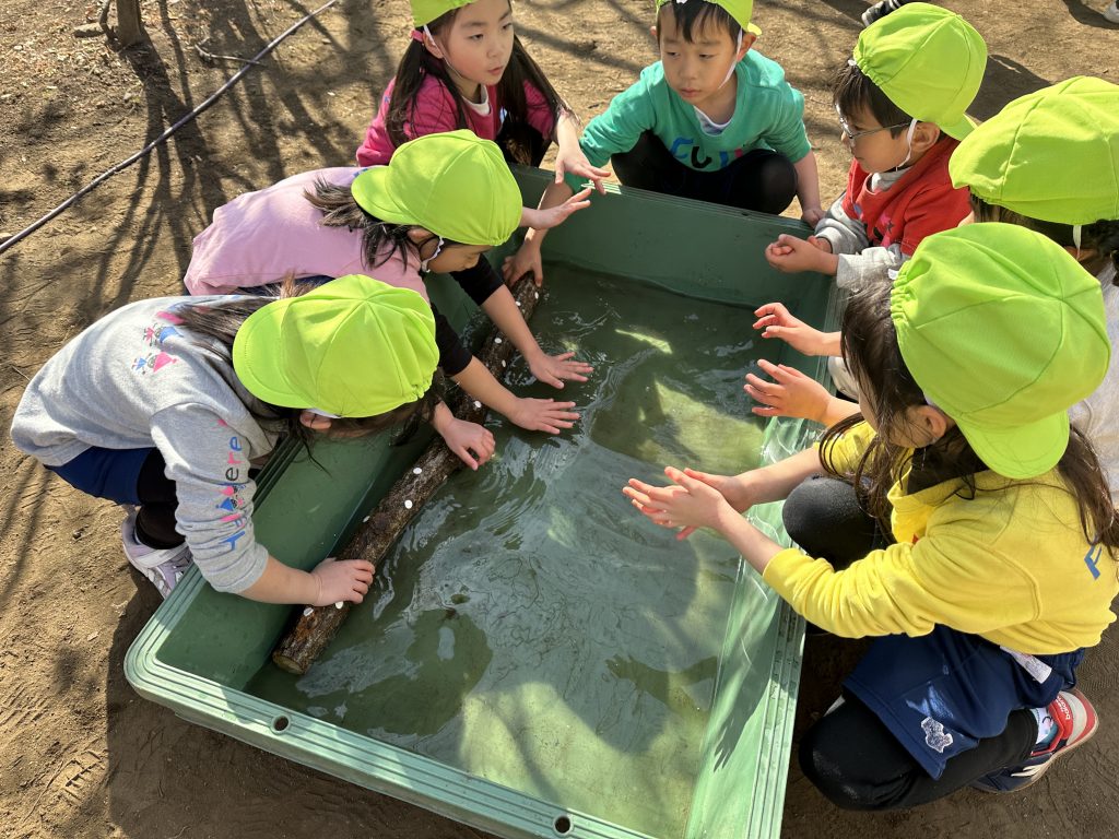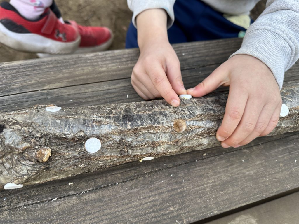 先日、子どもたちは、しいたけの菌を原木に植える植菌体験をしました。国分寺市の“さるかに農園”さんにご指導いただき行いました。原木にはコナラの木を使い、ドリルで穴をあけたところに子どもたちがしいたけ菌を埋めて行き、完成した原木を水につけてから、直射日光が当たらない日陰でゆっくり休ませます。秋には、おいしい原木しいたけをみんなで食べてみようと計画しています。今、スーパー等では、ほとんどが菌床しいたけですが、原木しいたけを一度食べてみると、味が濃くとても美味しいのがわかります。